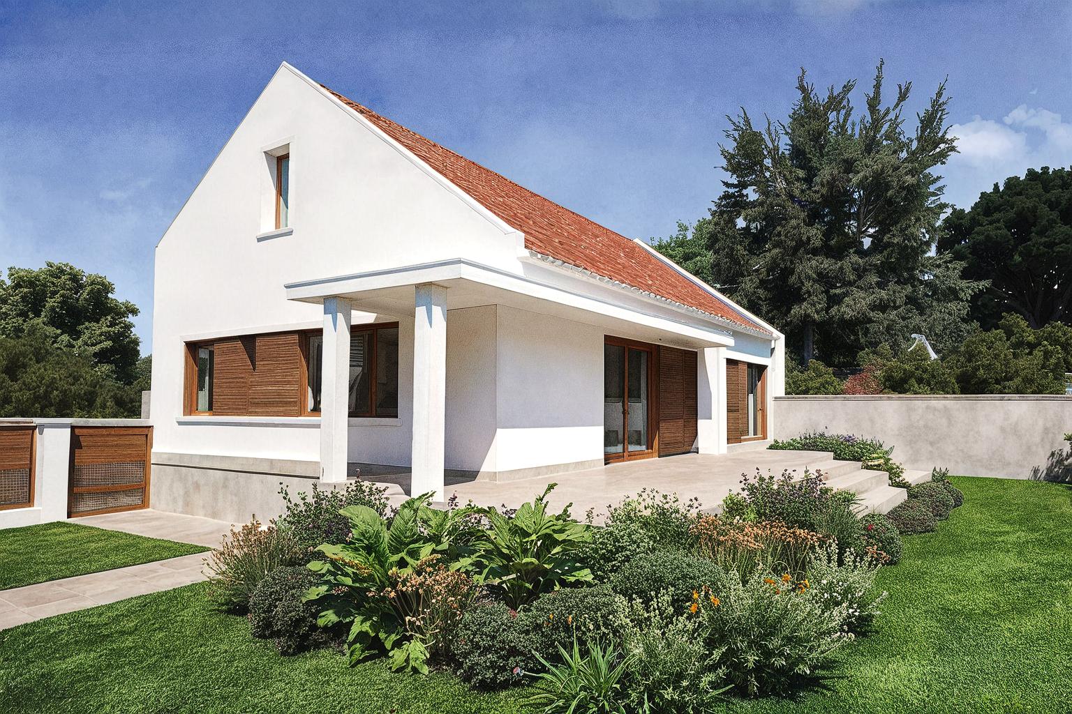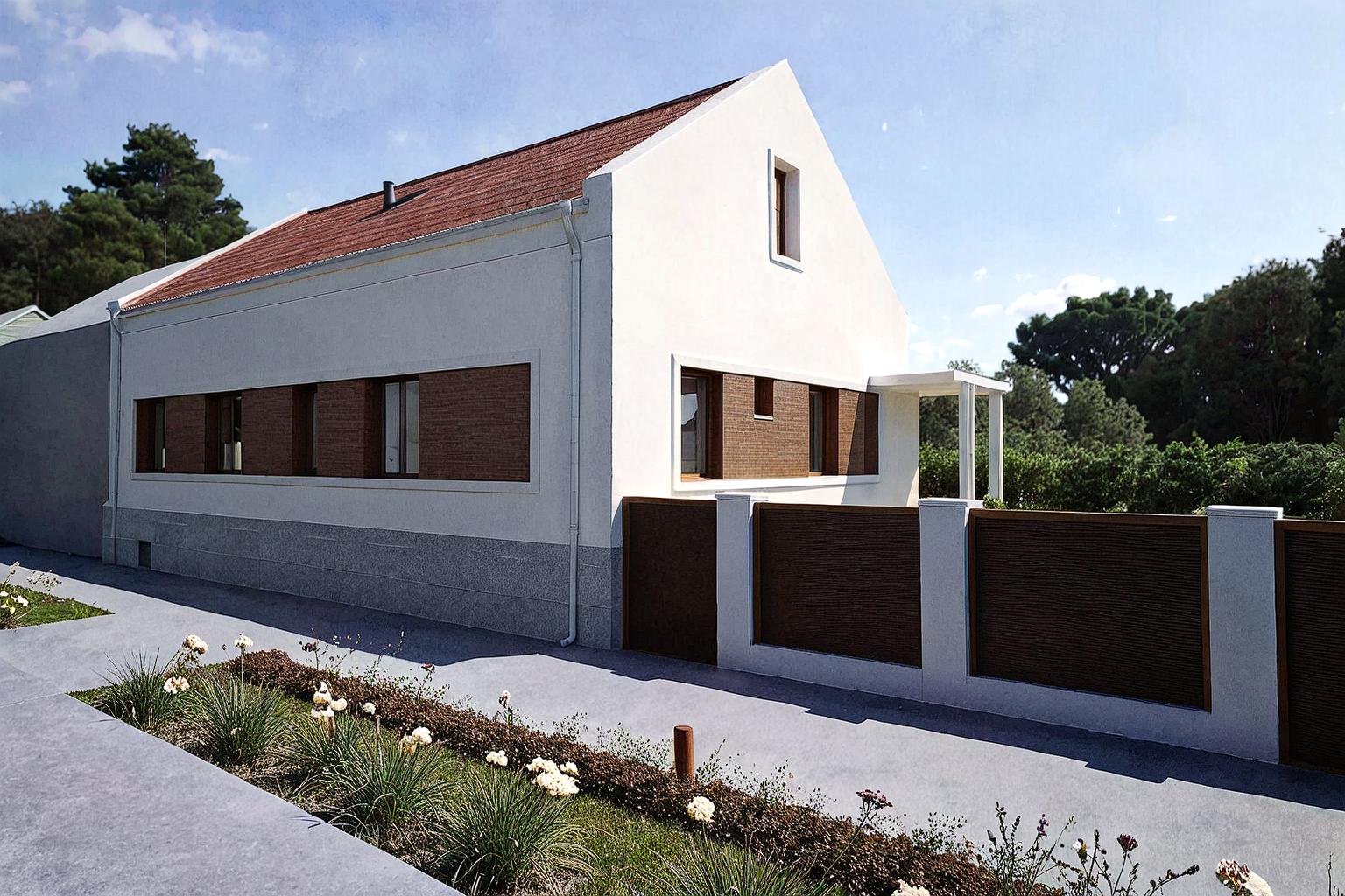 A homlokzatot is újragondoltuk: a meglévő nyílászárók átalakításával arányaiban harmonikusabb és korszerűbb megjelenést alakítottunk ki, miközben a ház karakterét is erősítettük.