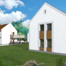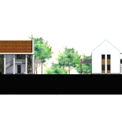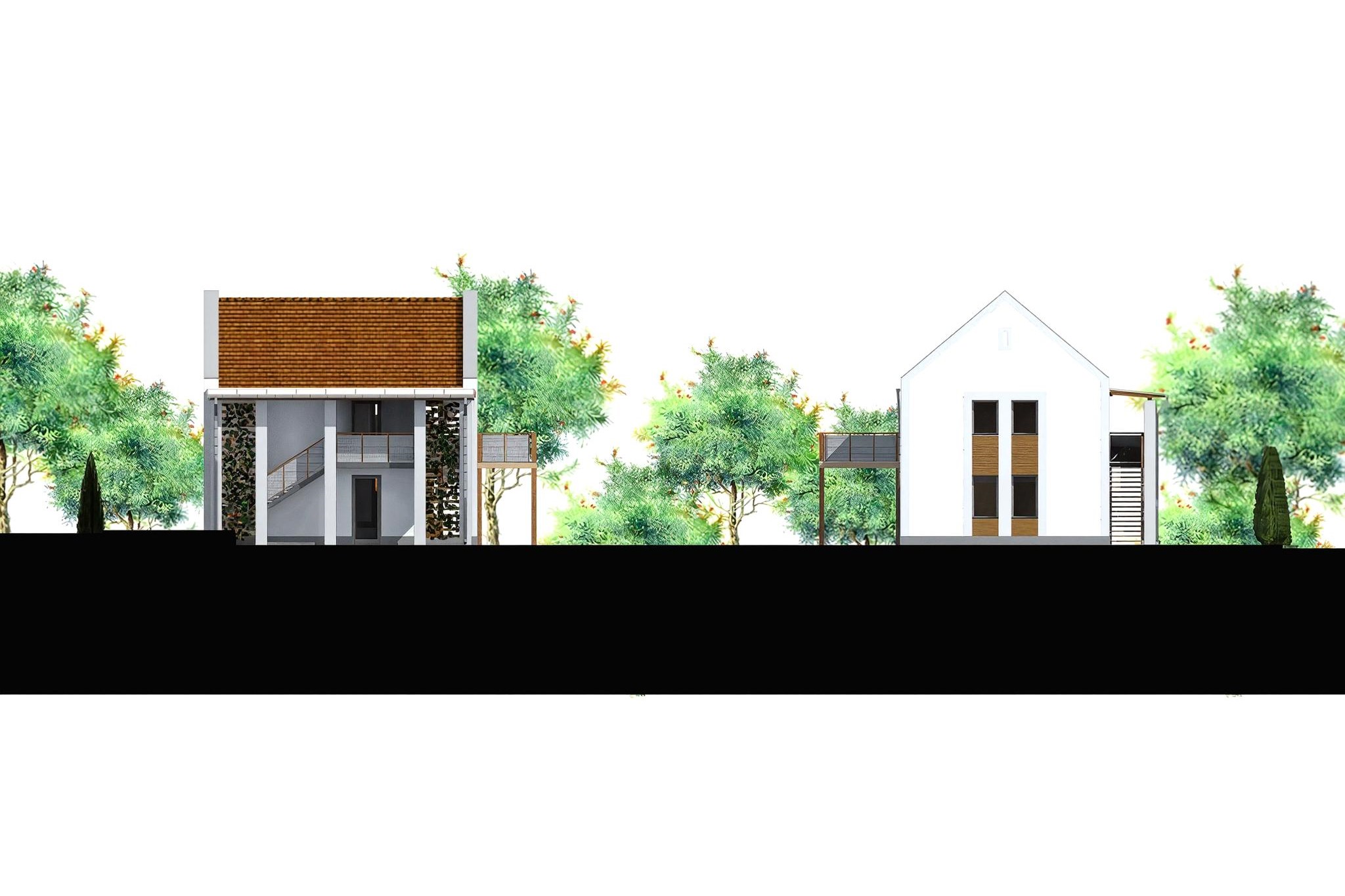A tervezési helyszín a település újonnan parcellázott részén, egy épülettömb sarkán helyezkedik el. A kisebb léptékű épülettömegekkel tudatosan törekedtünk arra, hogy a beépítés illeszkedjen a környezetéhez, és ne keltsen túlzottan nagy léptékű, idegen hatást.